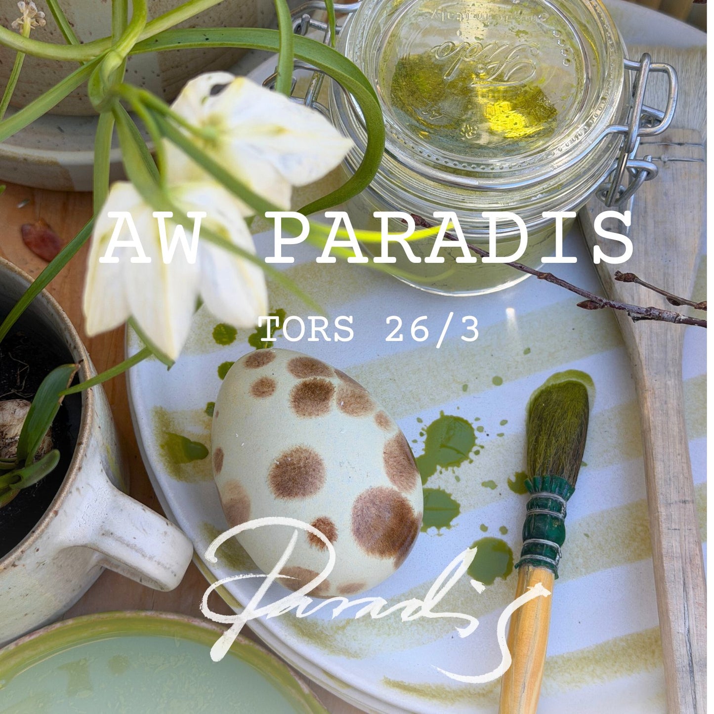 vi plockar fram krukor, lökar och blomsterfakirer. I vår ateljé finns möjlighet att delta i kvällens kreativa workshop och dekorera ett keramiskt påskägg.