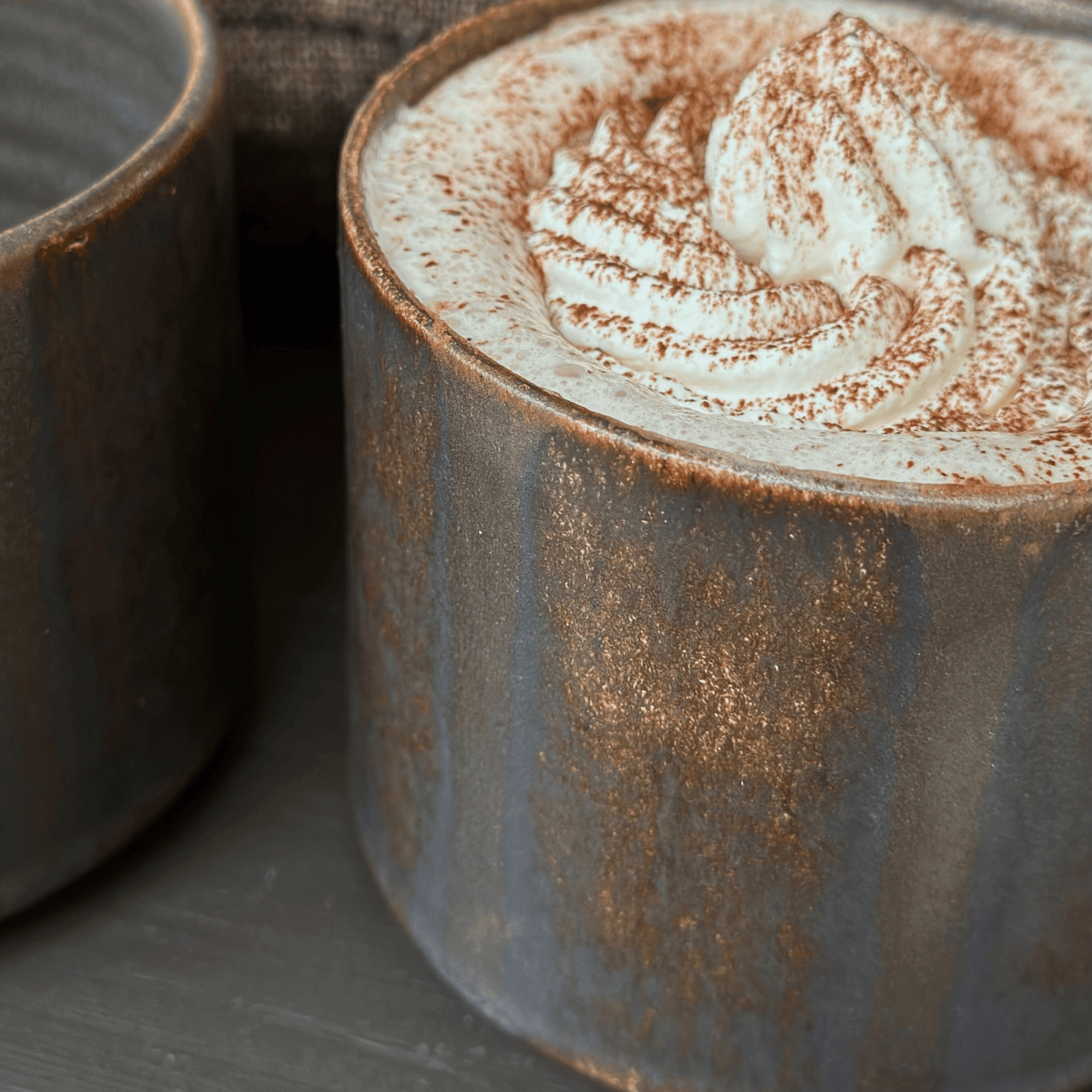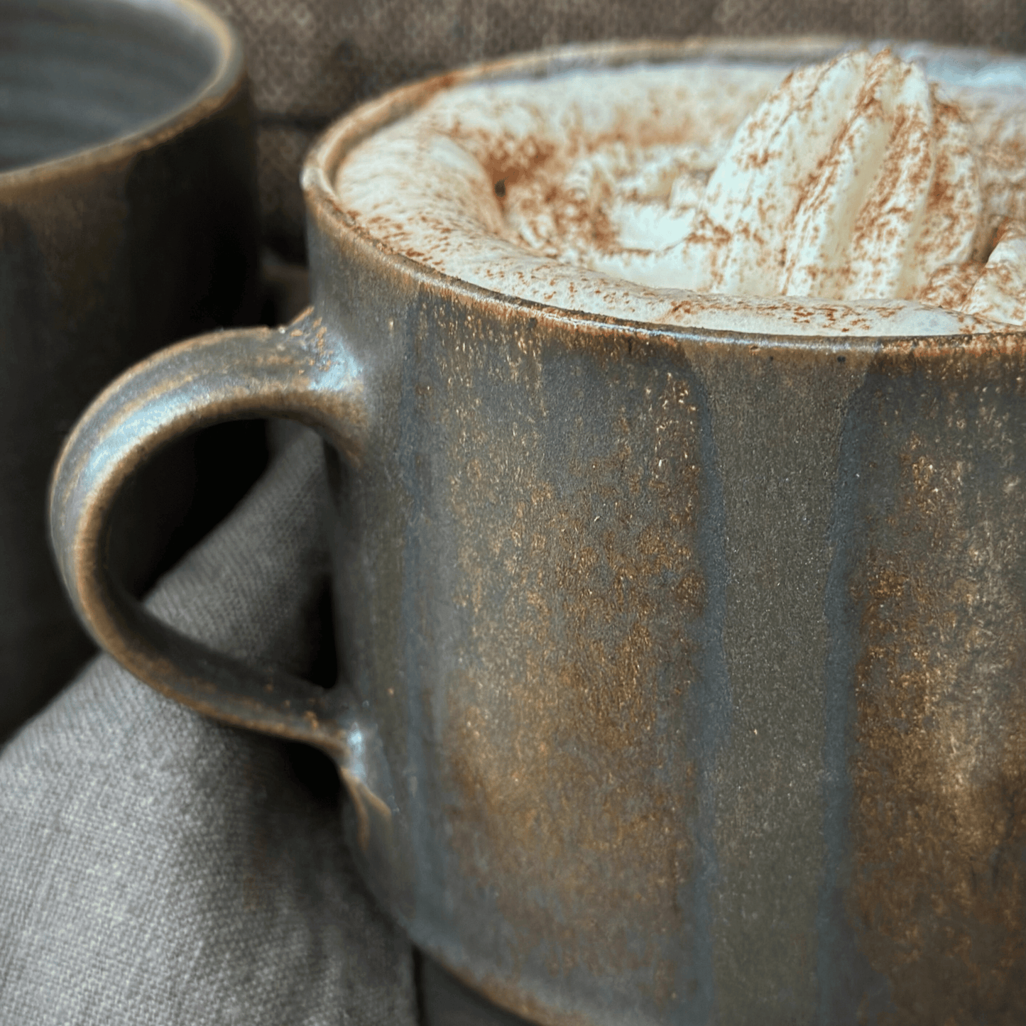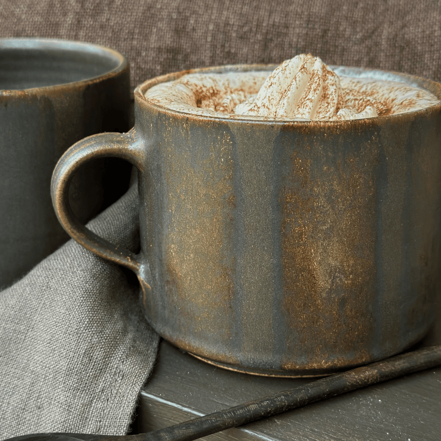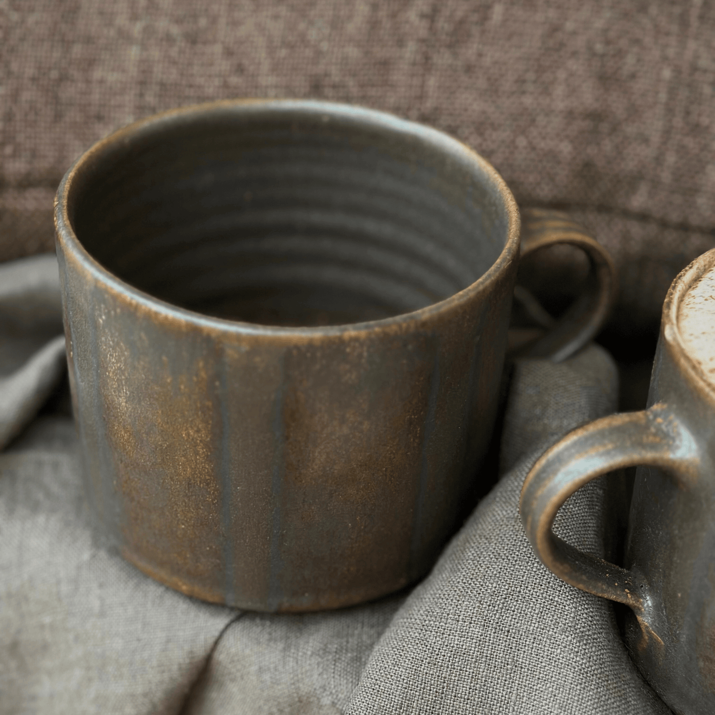 Handgjord brun tekopp i keramik med bredrandig glasyr i olika nyanser av brunt från serien Öland.
