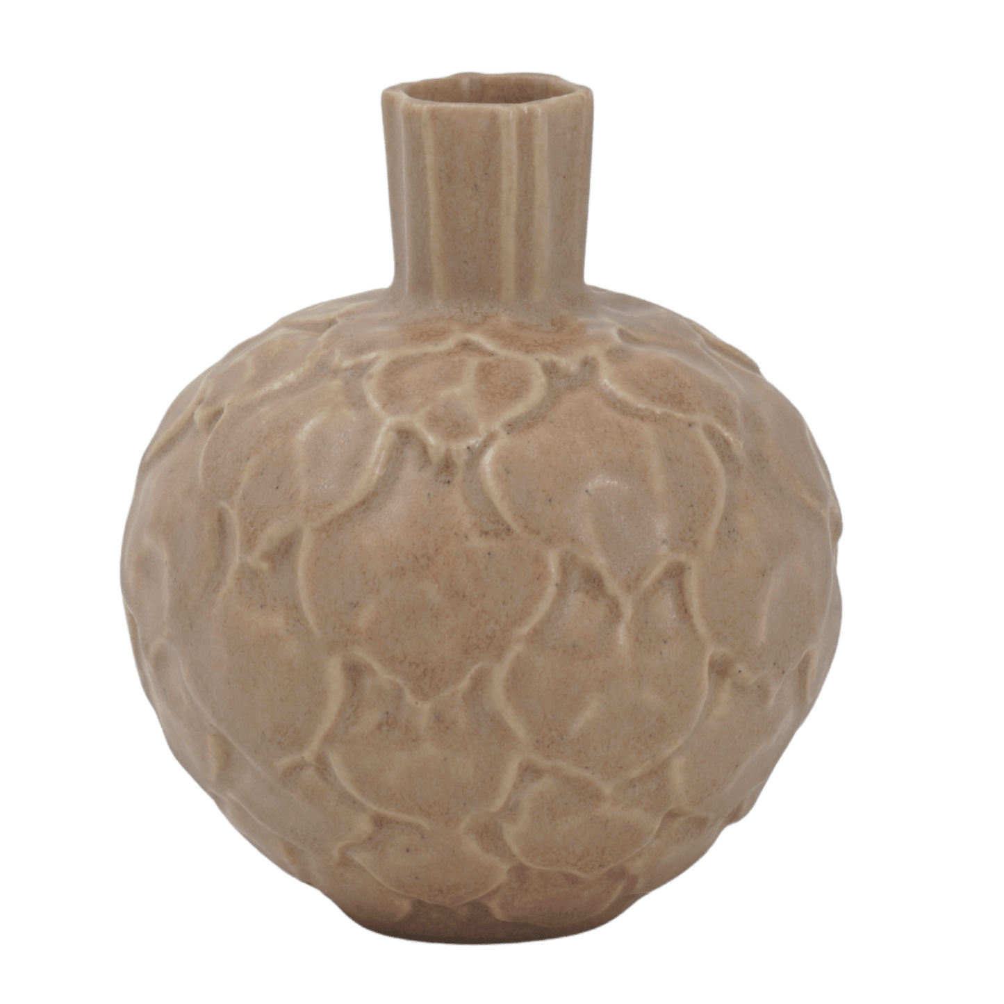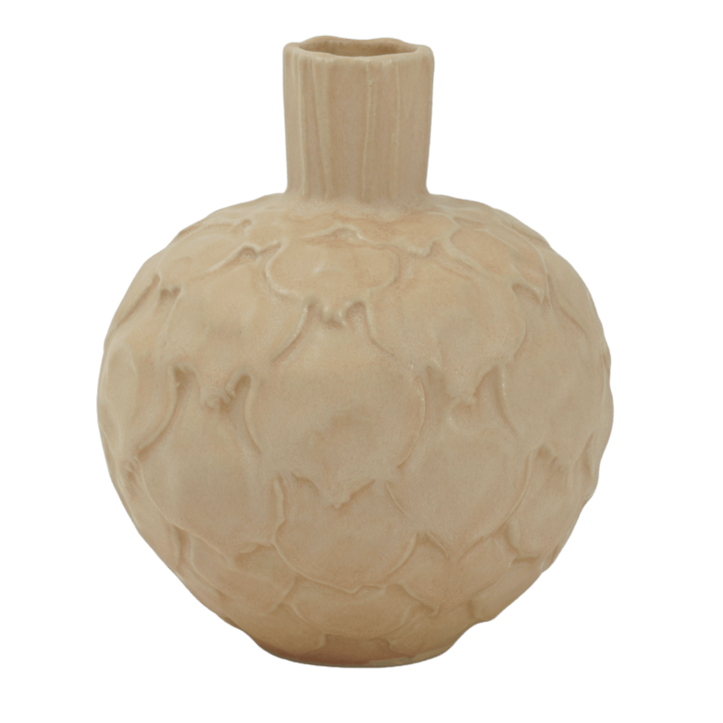 Kronärtskocka Liten – Sandfärgad vas i glaserad keramik med utskurna blad, handgjord av Paradisverkstaden på Öland