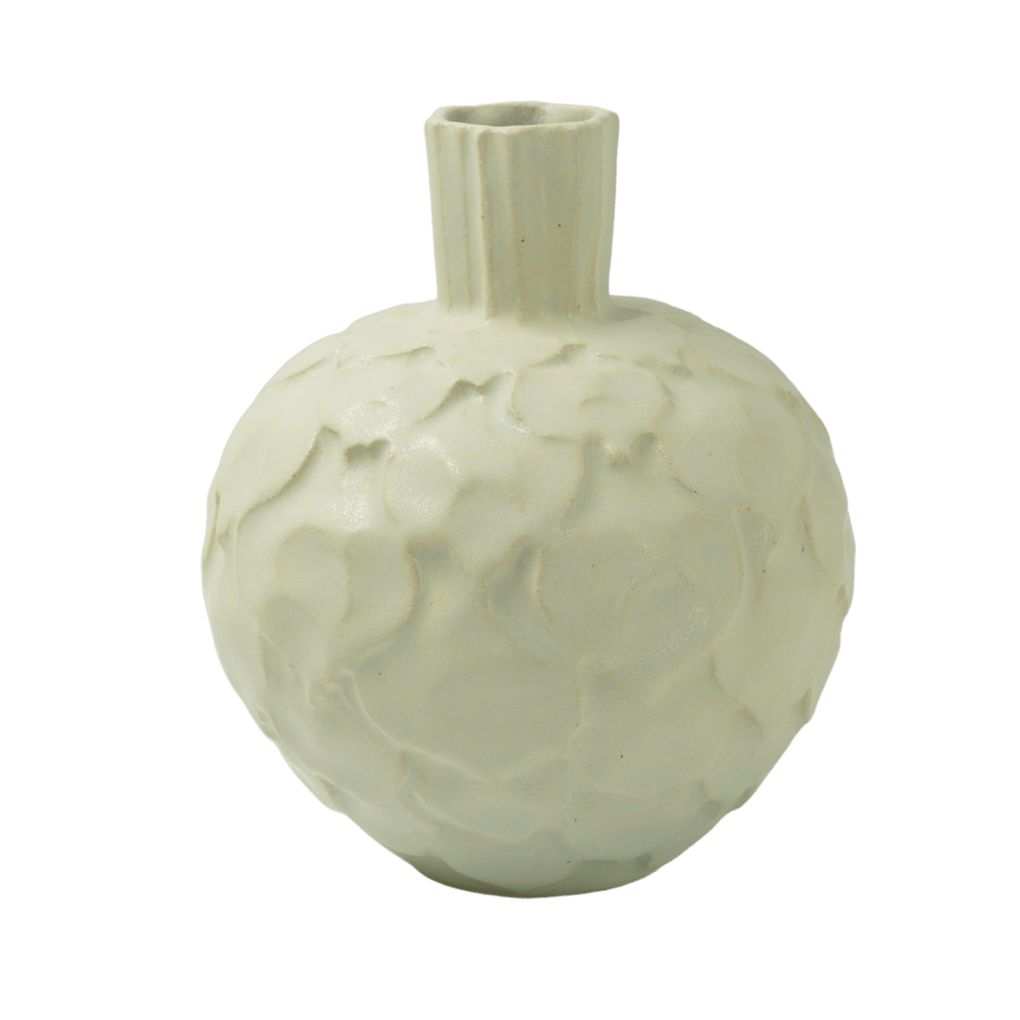 Kronärtskocka Liten – Vit vas i glaserad keramik med utskurna blad och blomster, handgjord av Paradisverkstaden på Öland