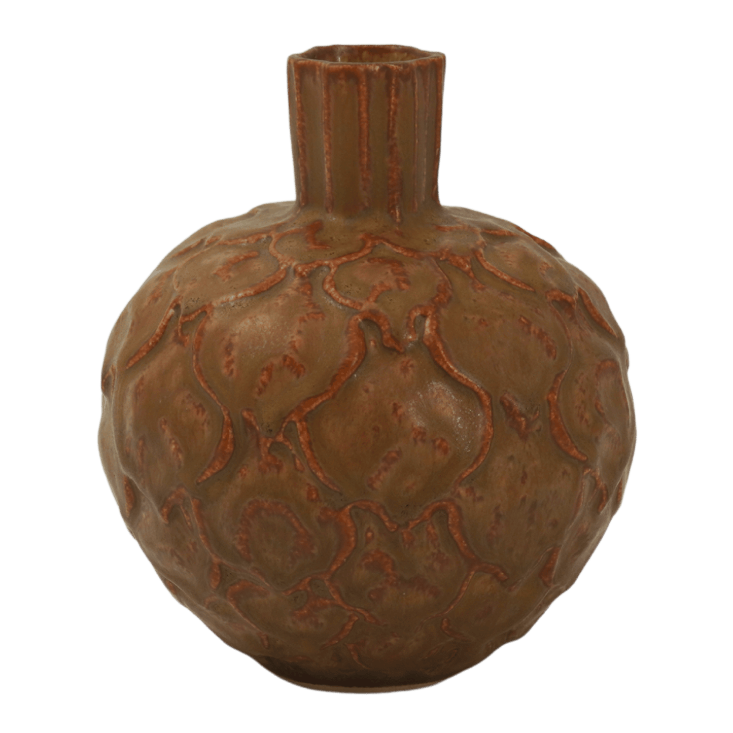 Kronärtskocka Liten – Brunfärgad vas i glaserad keramik med utskurna blad, handgjord av Paradisverkstaden på Öland