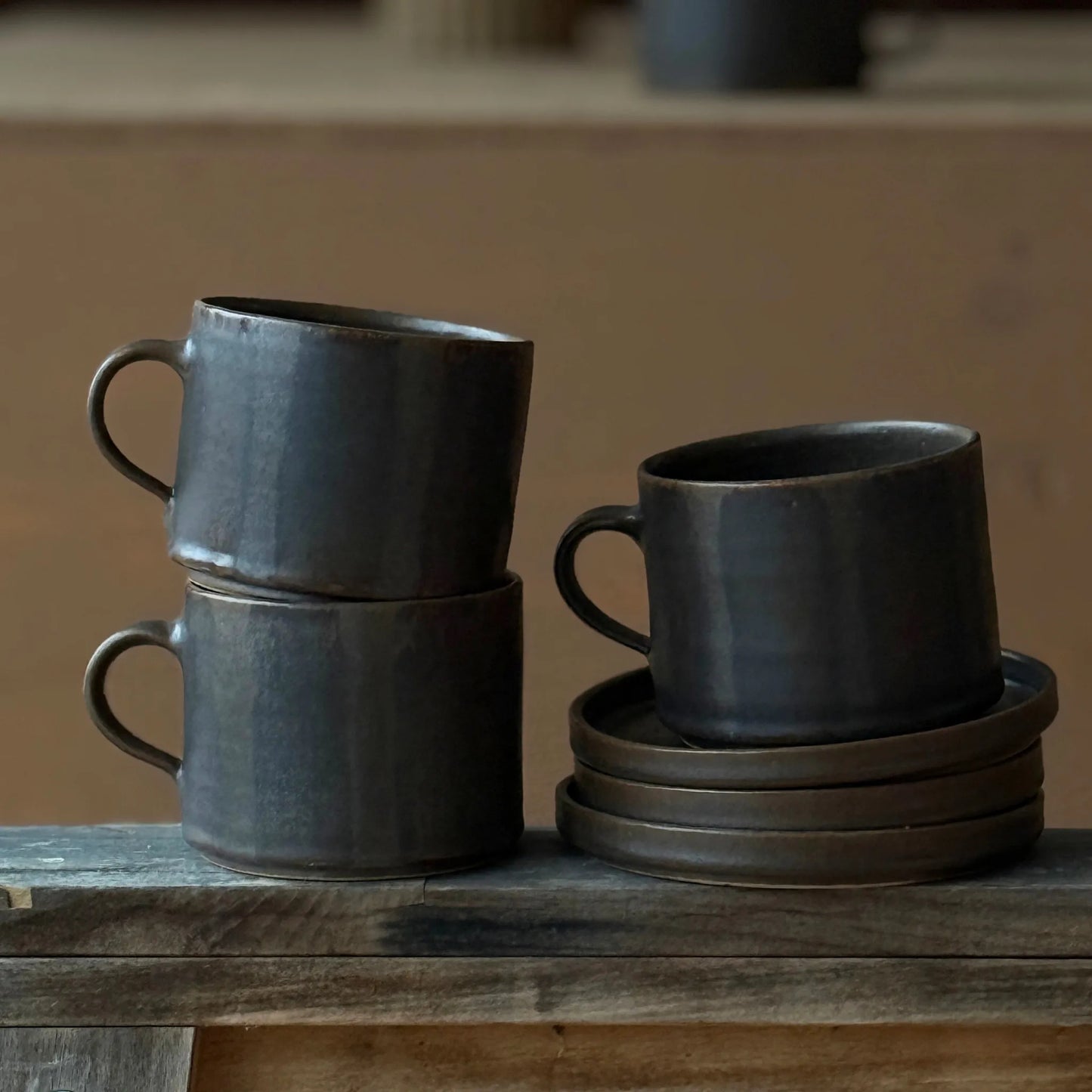 Handgjord brun tekopp i keramik med bredrandig glasyr i olika nyanser av brunt från serien Öland.