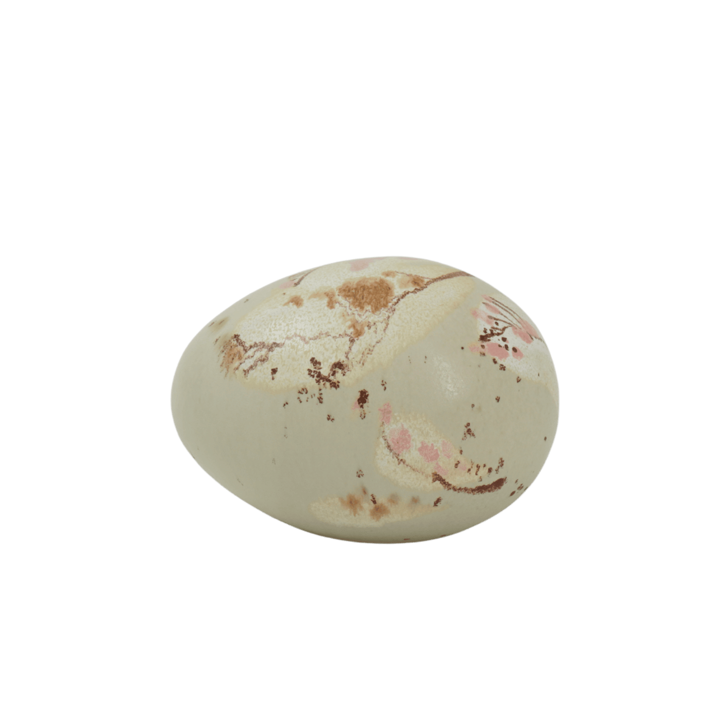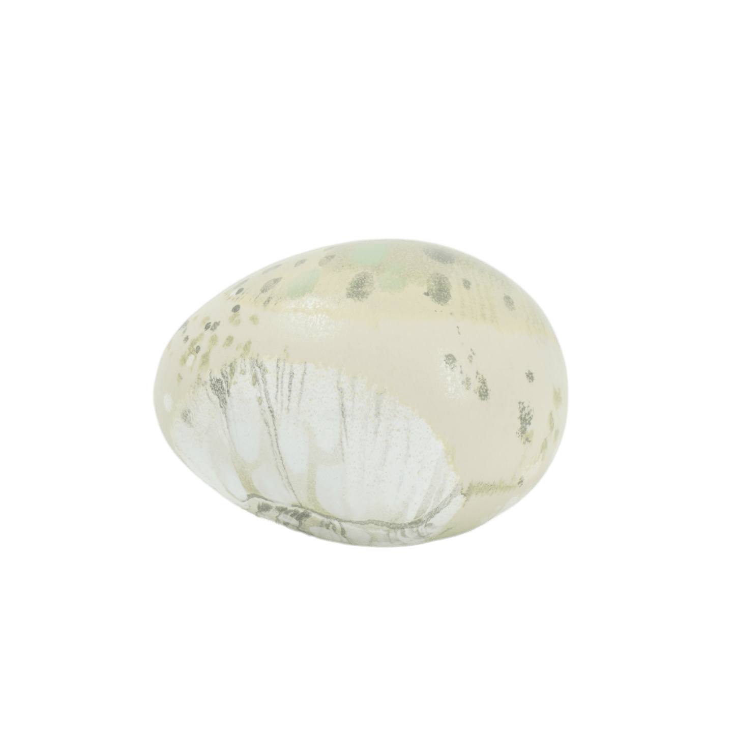 Rakubränt ägg i keramik med vit dekor och vackra krackeleringar