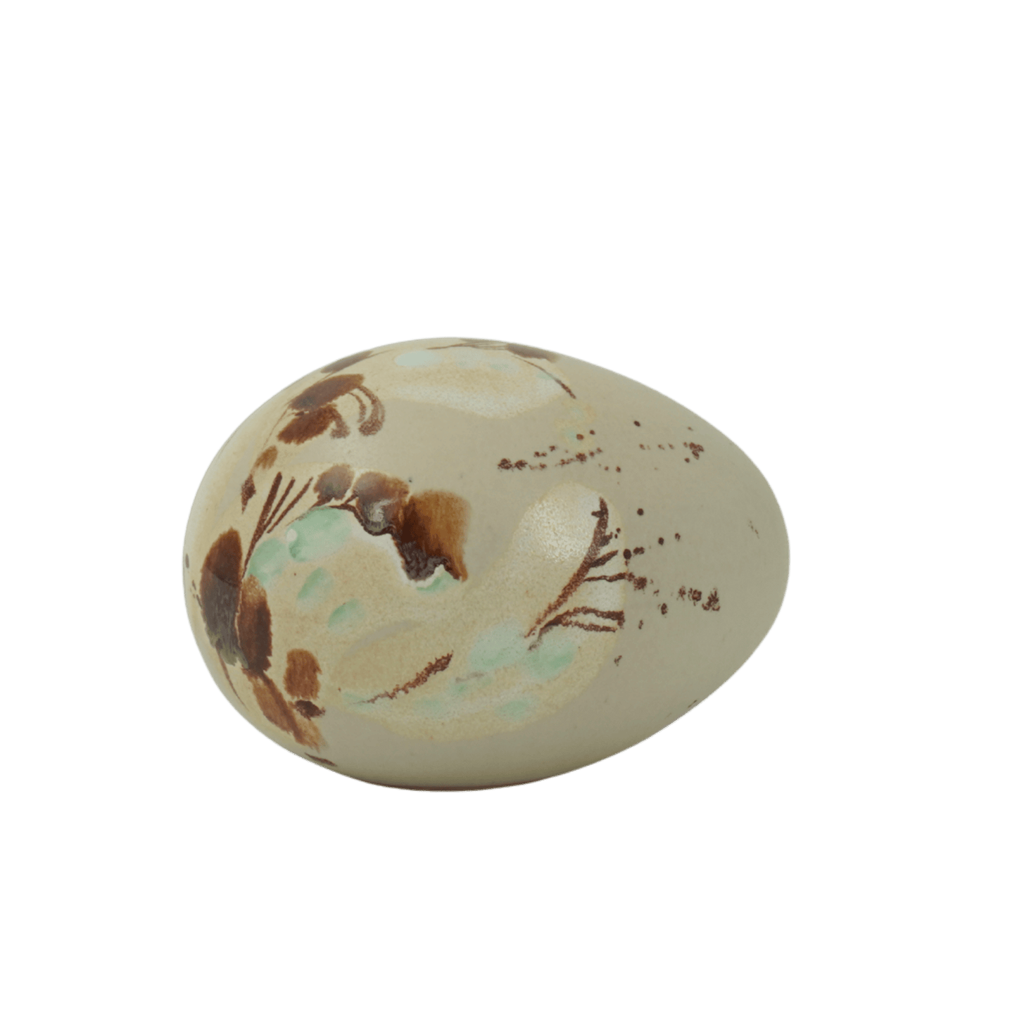 Handmålat ägg i keramik med havre som basfärg och gröna och bruna nyanser i dekor