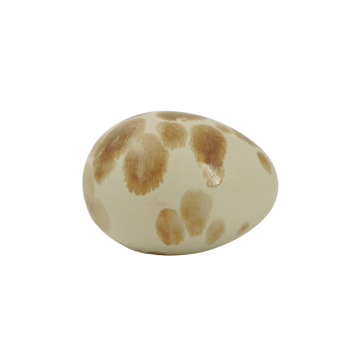 Paradisverkstadens handmålade ägg i keramik med dekor av fläckar/prickar. Havre bottenfärg med ocra-prickar.