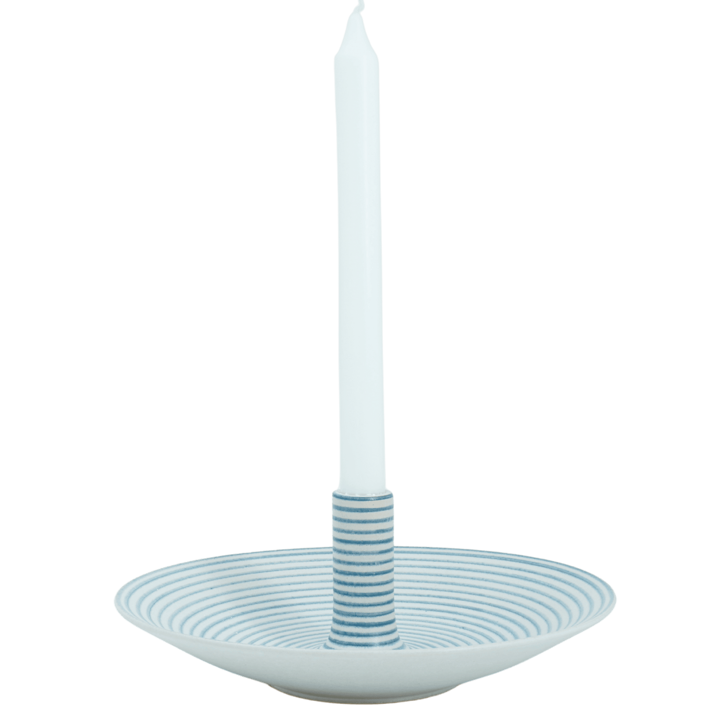 Handdrejat ljusfat i 25 cm med blå handmålade linjer – svenskt hantverk från Paradisverkstaden på Öland.
