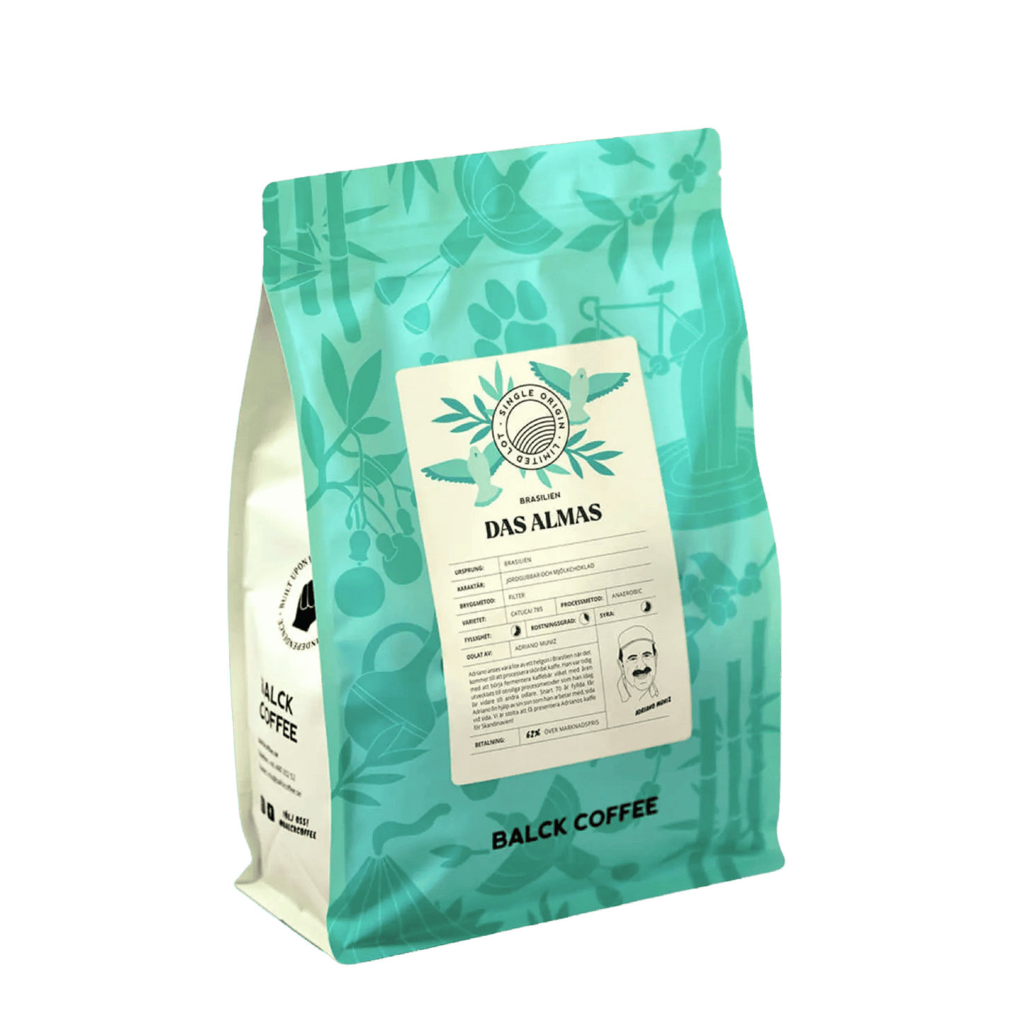 Påse med Das Almas-kaffe från Balck Coffee, specialkaffe från Brasilien med toner av jordgubbar och mjölkchoklad.